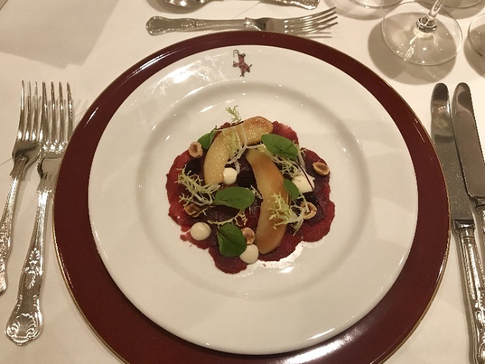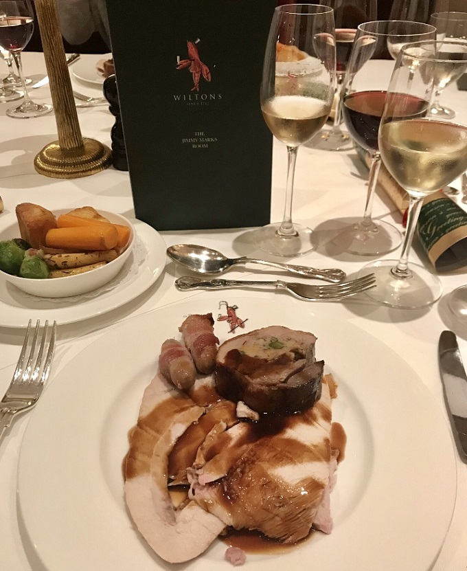 After enjoying champagne and canapes upon arrival my party sat down to a dinner in the private Jimmy Marks dining room. To start the festive meal, we enjoyed a dish of Venison Carpaccio with a Quince and Hazelnut Salad. The star of the meal was the beautifully roasted Norfolk Turkey which was presented on Wiltons’ traditional carving trolley to audible gasps in the room. It’s a showstopper when its wheeled out and revealed from under its silver domed cocoon. The bird was expertly carved in front of us and was served with all the trimmings including roast potatoes, honey truffles parsnips and Brussels sprouts. It was delicious and got us feeling very Christmassy.