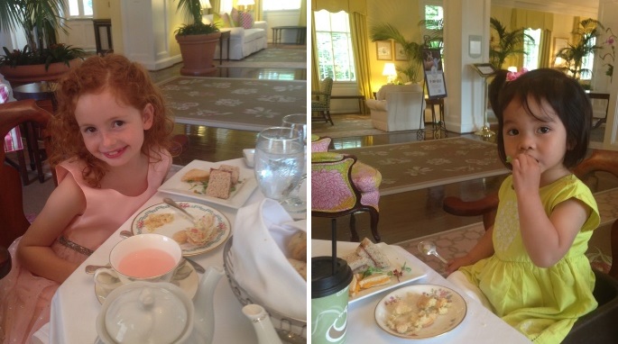 The menu was delicious. The first plate was a selection of savoury sandwiches, such as cucumber and cream cheese, while the Princesses at the table loved their own plates of peanut butter and jam and grilled cheese sandwiches. Next to be served were freshly backed scones with jam and Devonshire cream and sweet treats including delicate cupcakes and macaroons. The most popular however was a final course of delicious chocolate covered strawberries. The vintage feel of the tea & its menu is further added to by the eclectic mix of vintage crockery and tea cups, which have been collected over time by the hotel’s owner. The tea menu was wide ranging but of course, considering our location, I opted for a fruity Blueberry tea named ‘Carolina Blue’. Children are served pink lemonade is their very own china teapots which of course were popular with the children.