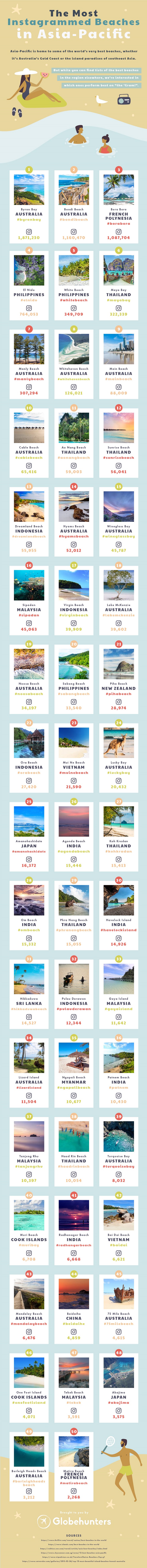 Asia-Pacific is home to some of the world’s very best beaches, whether it is Australia’s Gold Coast or the island paradises of south- east Asia. But while you can find lists of the best beaches in the region elsewhere, our friends over at Globehunters have compiled an infographic of the ones that really are picture-perfect – the ones that perform best on the ‘Gram! It seems #Byron Bay is the most popular beach hashtag in Australia (beating #Bondi) while the glorious #Borabora in Tahiti is the most popular in the rest of the Asia pacific. And once you have picked your personal favourite Globehunters have the best airfare deals to fly you there.